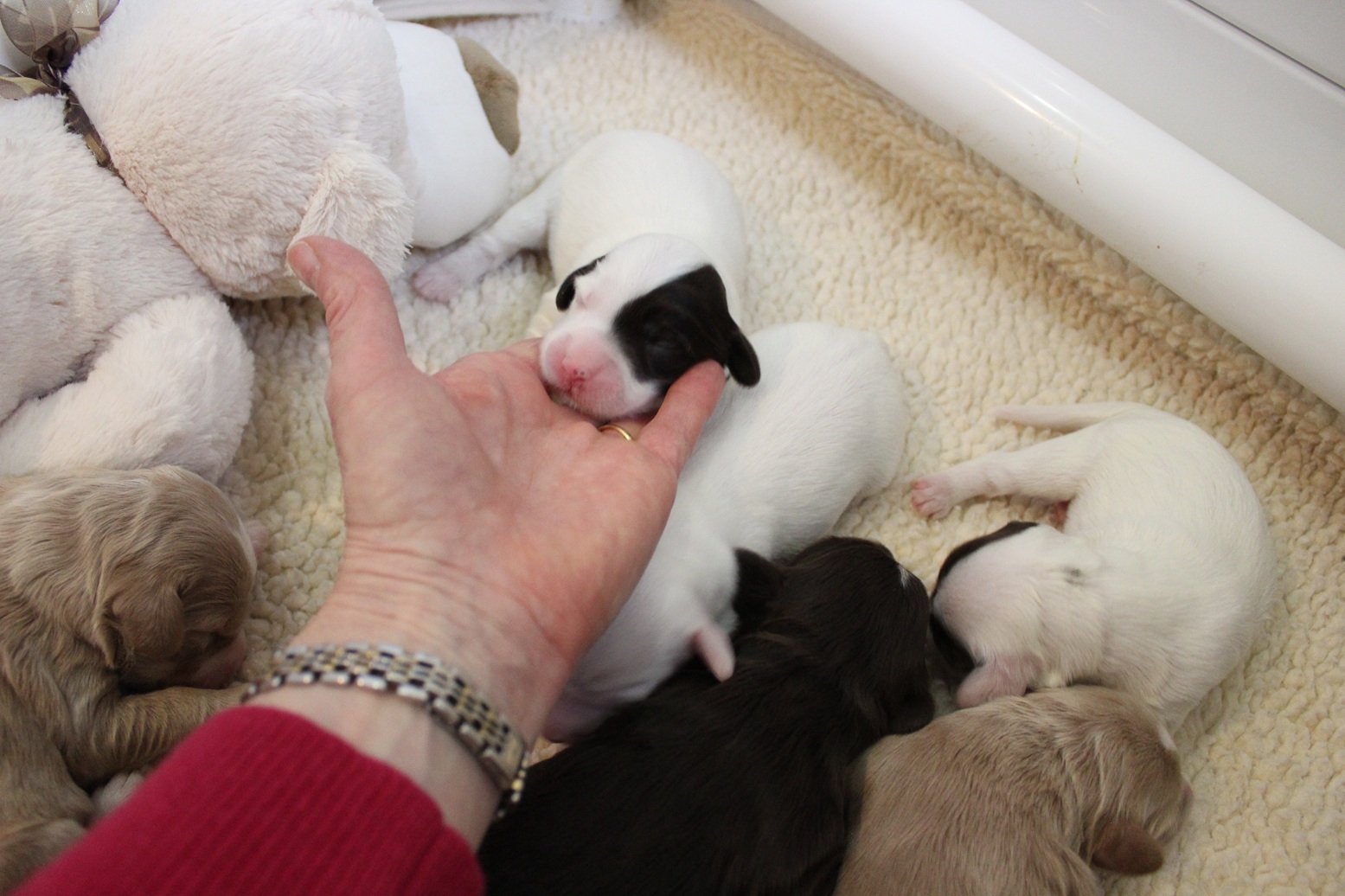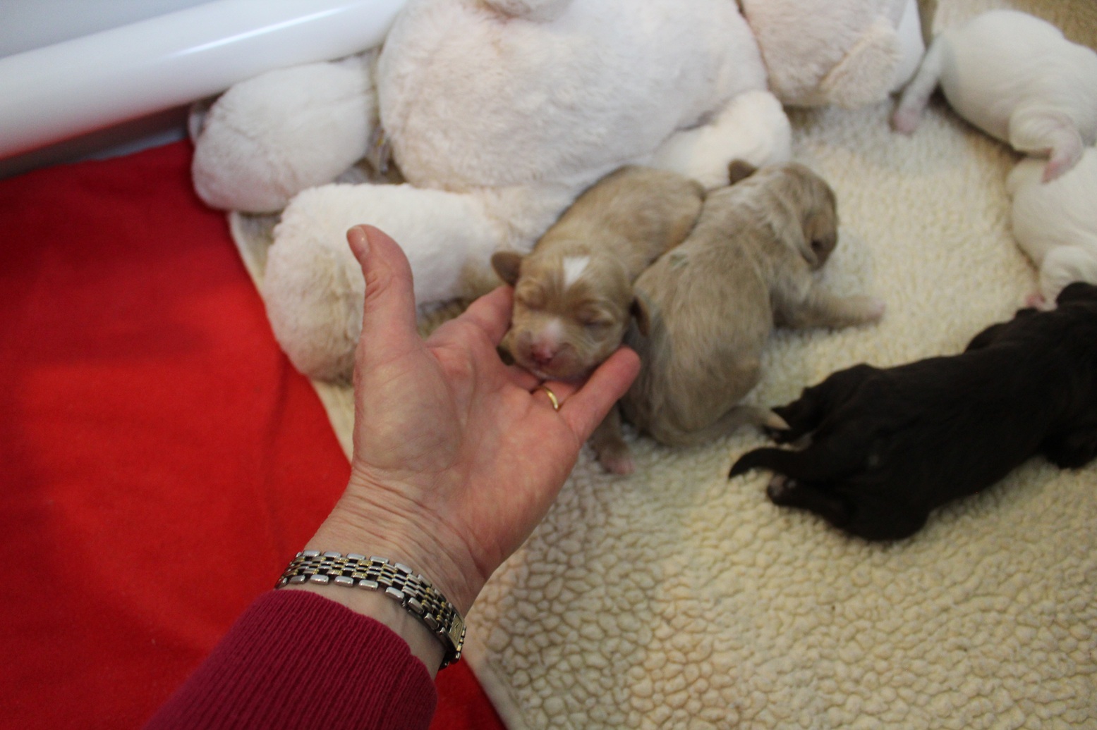 We are excited to have welcomed a lovely litter of miniature puppies from Harper and Chip! Harper has 7 gorgeous puppies (4 girls, 3 boys). Three are light caramel, three are chocolate parti and one is chocolate. Once fully grown we expect the puppies to reach around 15-17" at the shoulder and around 10-12kg. We only have two places available on this litter so please get in touch if you'd like to apply for one of Harper and Chip's puppies!