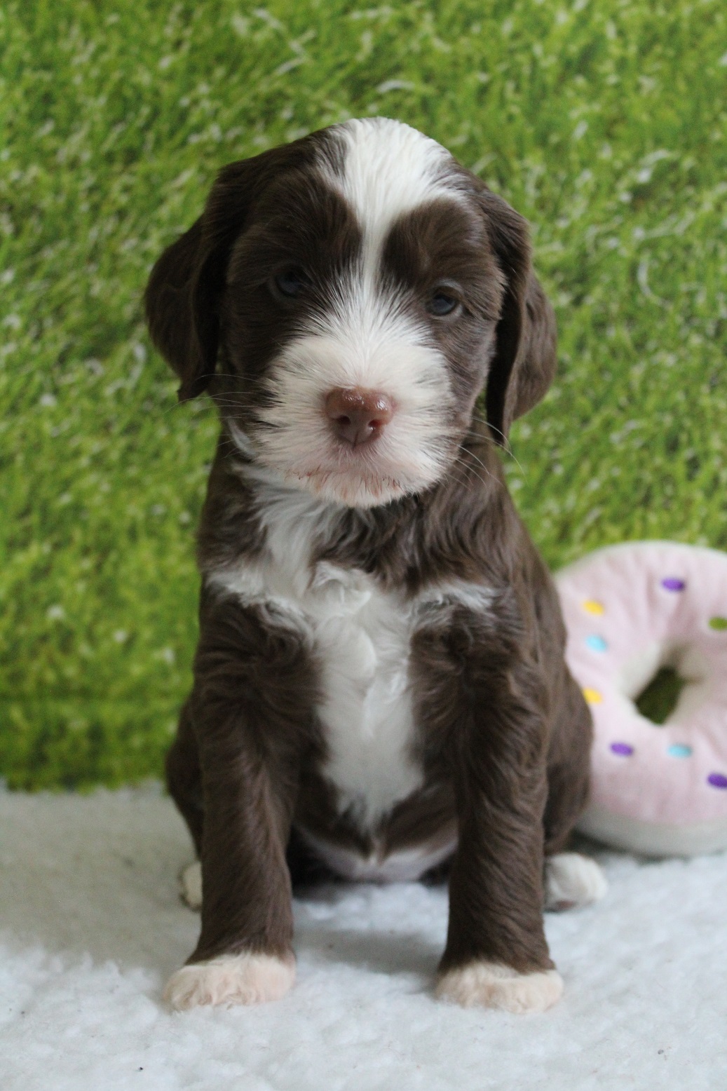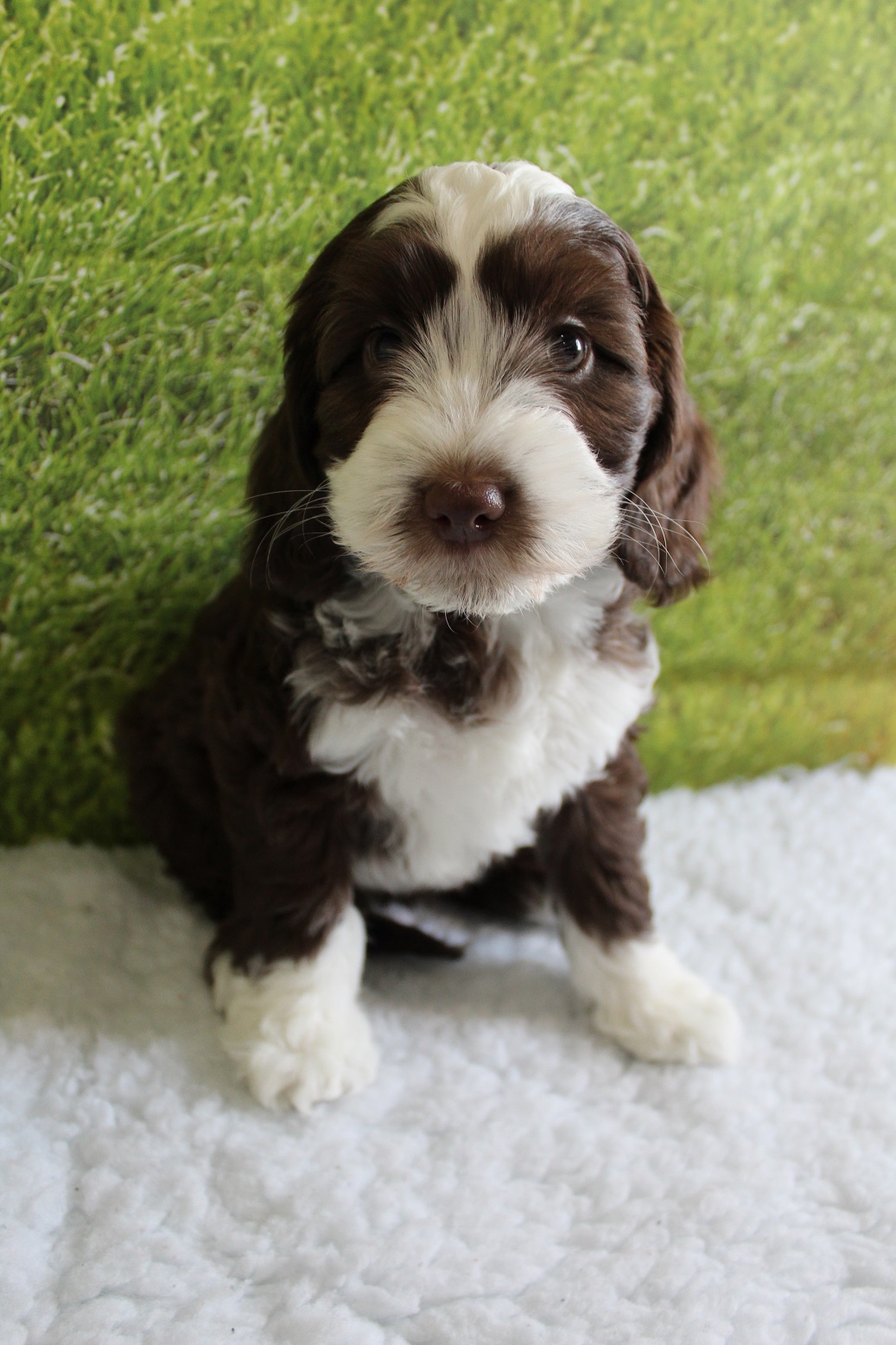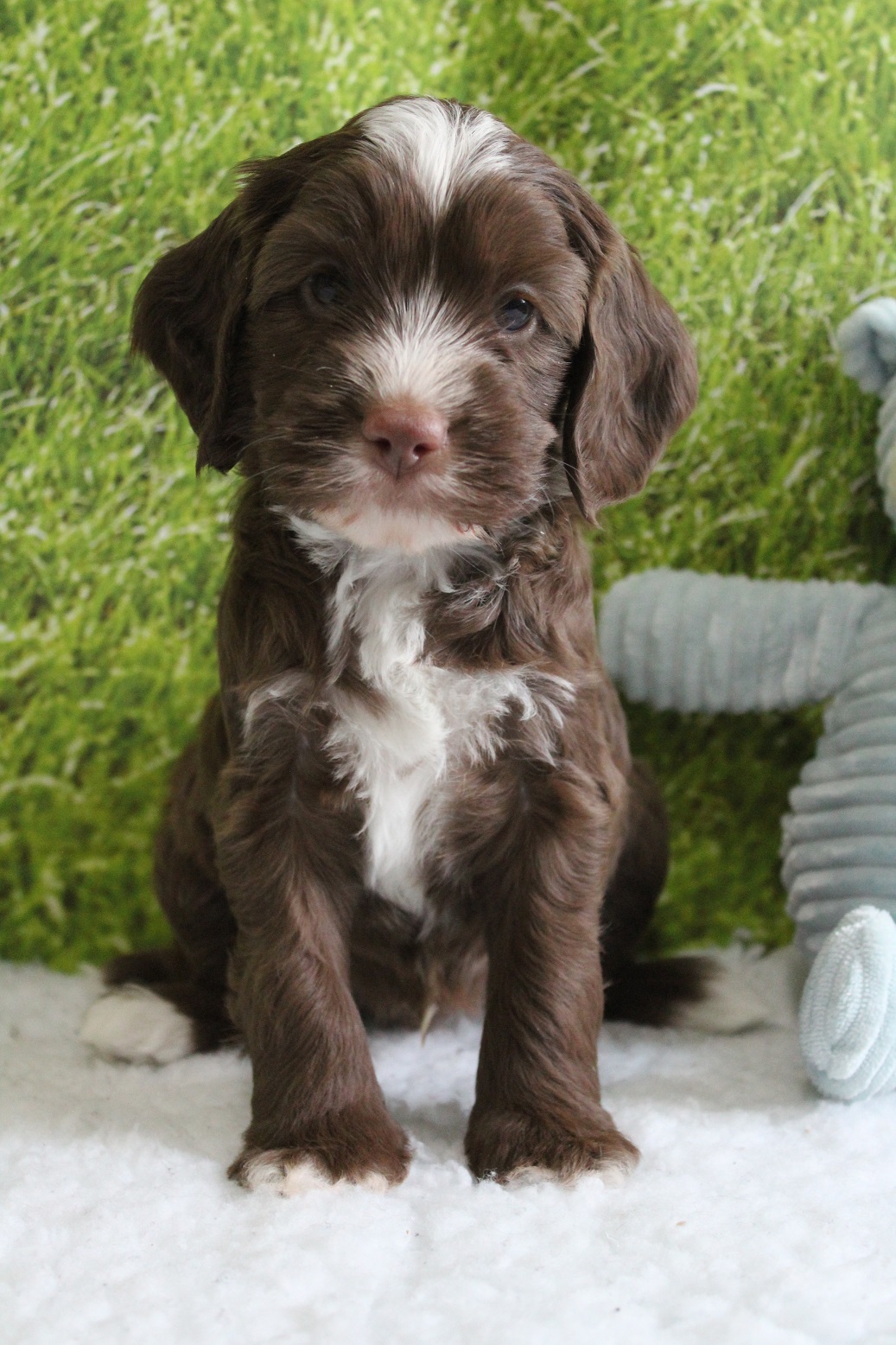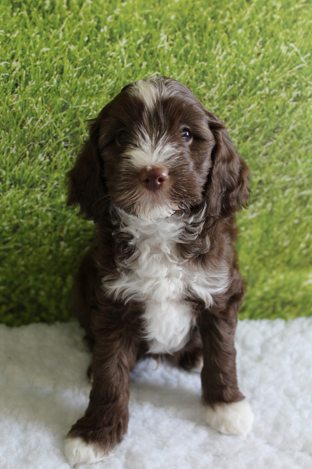Winnie and Chester's puppies were so beautiful last year we just had to do it again this year! Winnie is now in season so all being well her puppies will be with us at the end of the year and ready to go to their forever homes at the end of February 2026. We are once again expecting Winnie to have a litter of large miniature/small medium chocolate and white puppies with loose fleece coats. Once fully grown we expect the puppies to reach around 16-18" at the shoulders/10-13kg. You can see pictures of the their puppies from last year above. Please get in touch if you'd like to join this litter