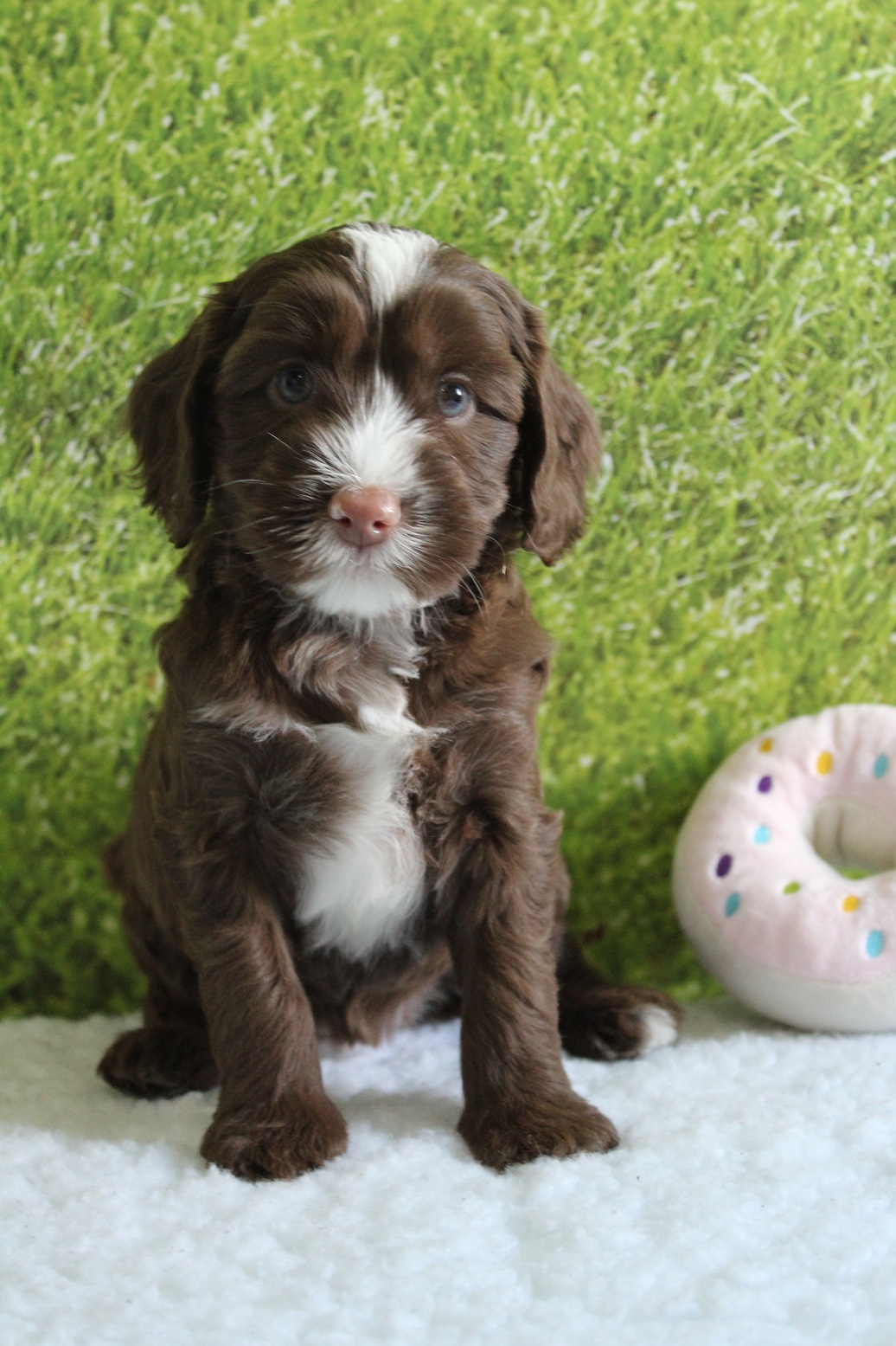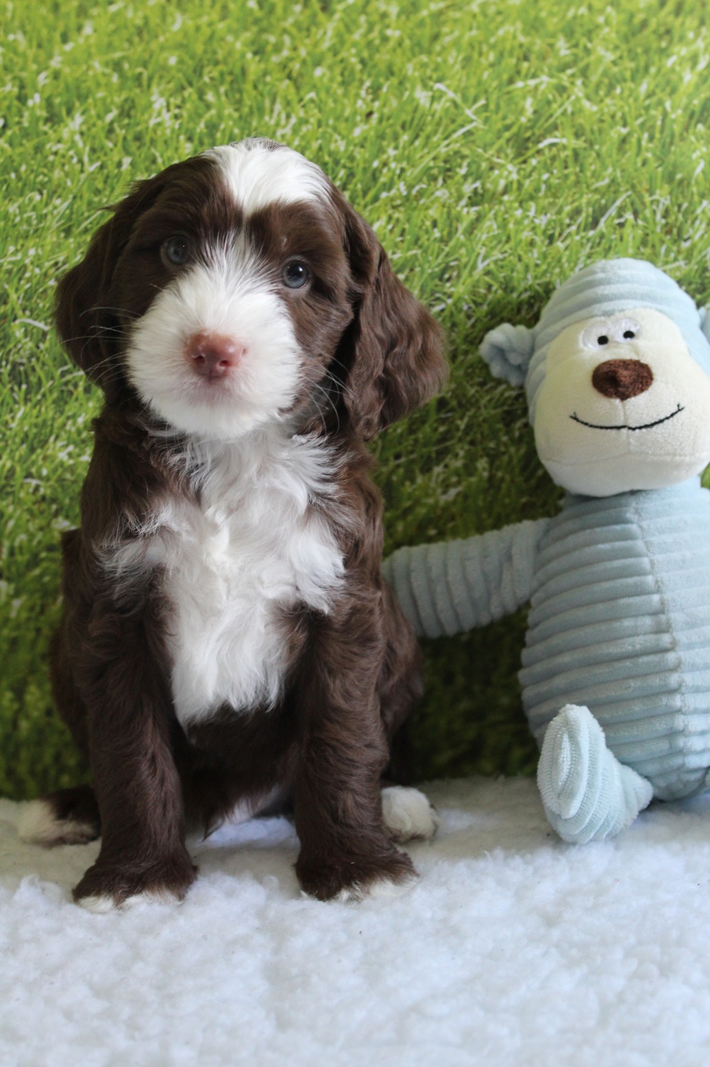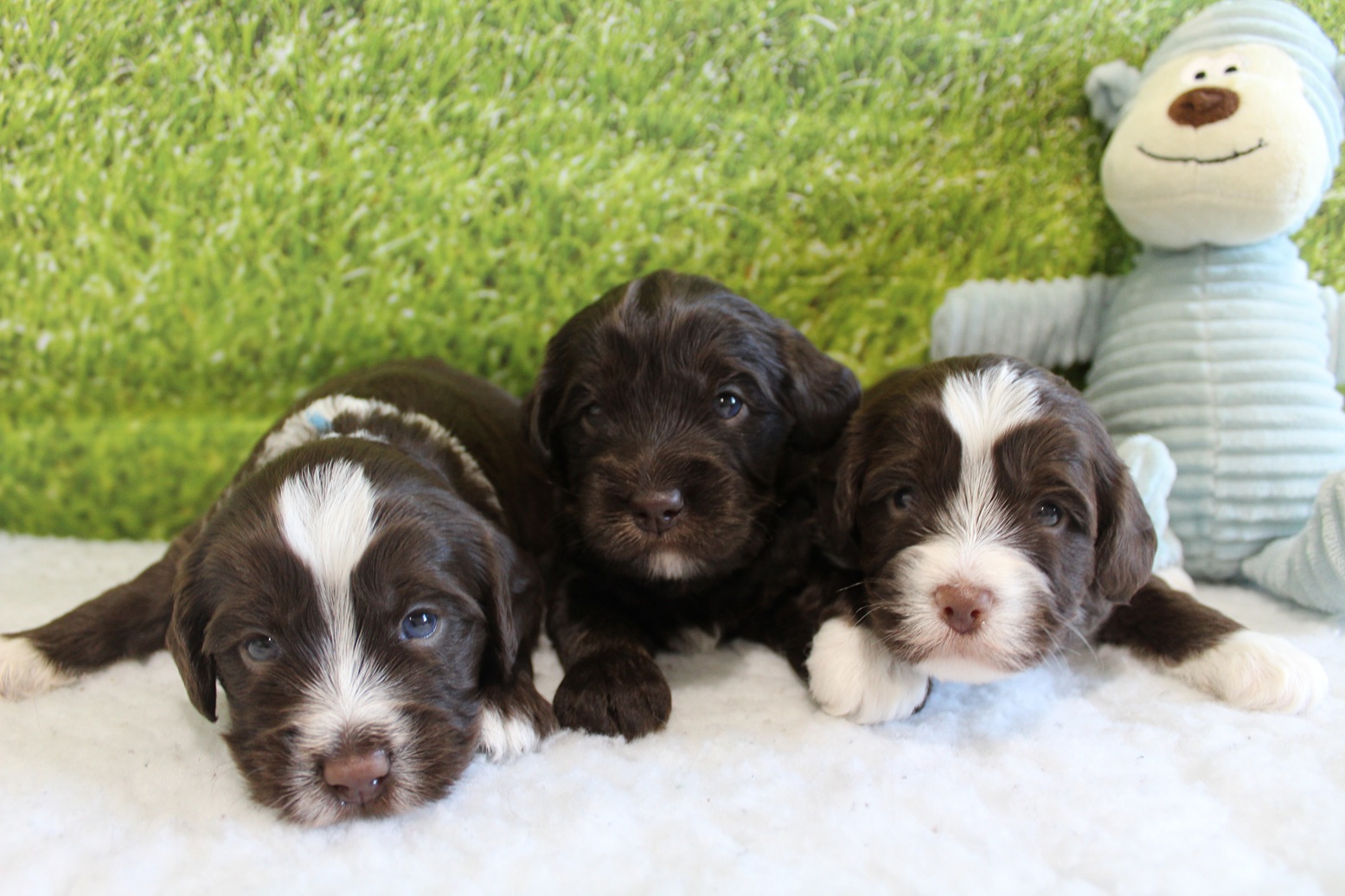 Winnie and Chester's puppies were so beautiful last year we just had to do it again this year! Winnie is now in season so all being well her puppies will be with us at the end of the year and ready to go to their forever homes at the end of February 2026. We are once again expecting Winnie to have a litter of large miniature/small medium chocolate and white puppies with loose fleece coats. Once fully grown we expect the puppies to reach around 16-18" at the shoulders/10-13kg. You can see pictures of the their puppies from last year above. Please get in touch if you'd like to join this litter