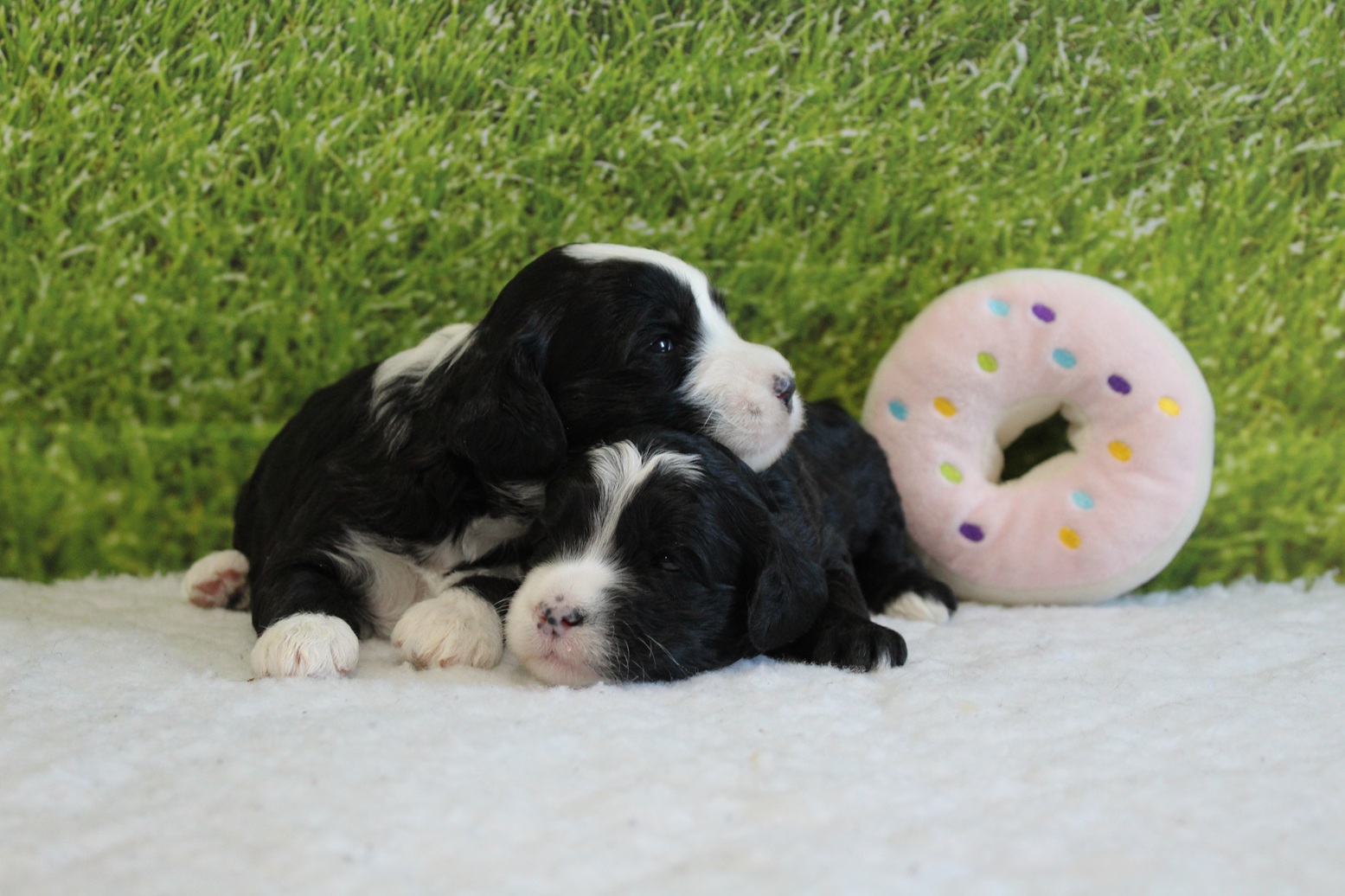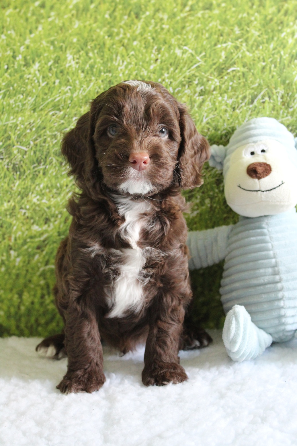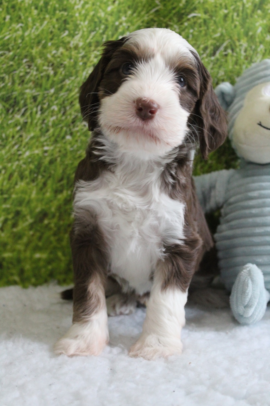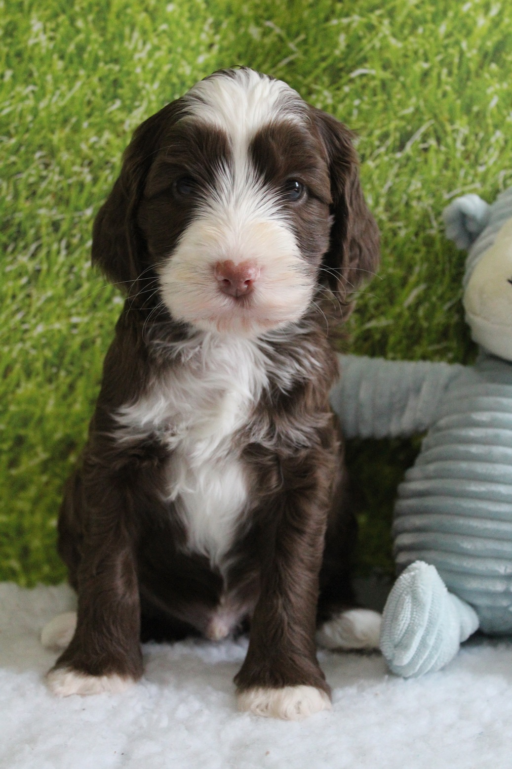 Winnie and Chester's puppies were so beautiful last year we just had to do it again this year! Winnie is now in season so all being well her puppies will be with us at the end of the year and ready to go to their forever homes at the end of February 2026. We are once again expecting Winnie to have a litter of large miniature/small medium chocolate and white puppies with loose fleece coats. Once fully grown we expect the puppies to reach around 16-18" at the shoulders/10-13kg. You can see pictures of the their puppies from last year above. Please get in touch if you'd like to join this litter
