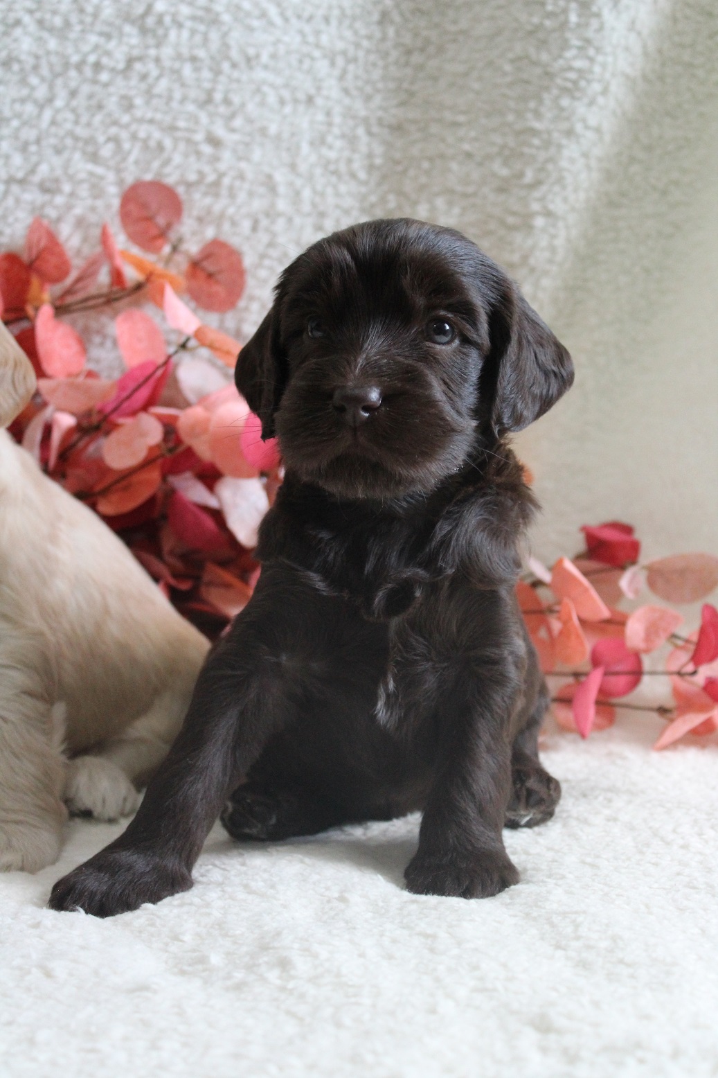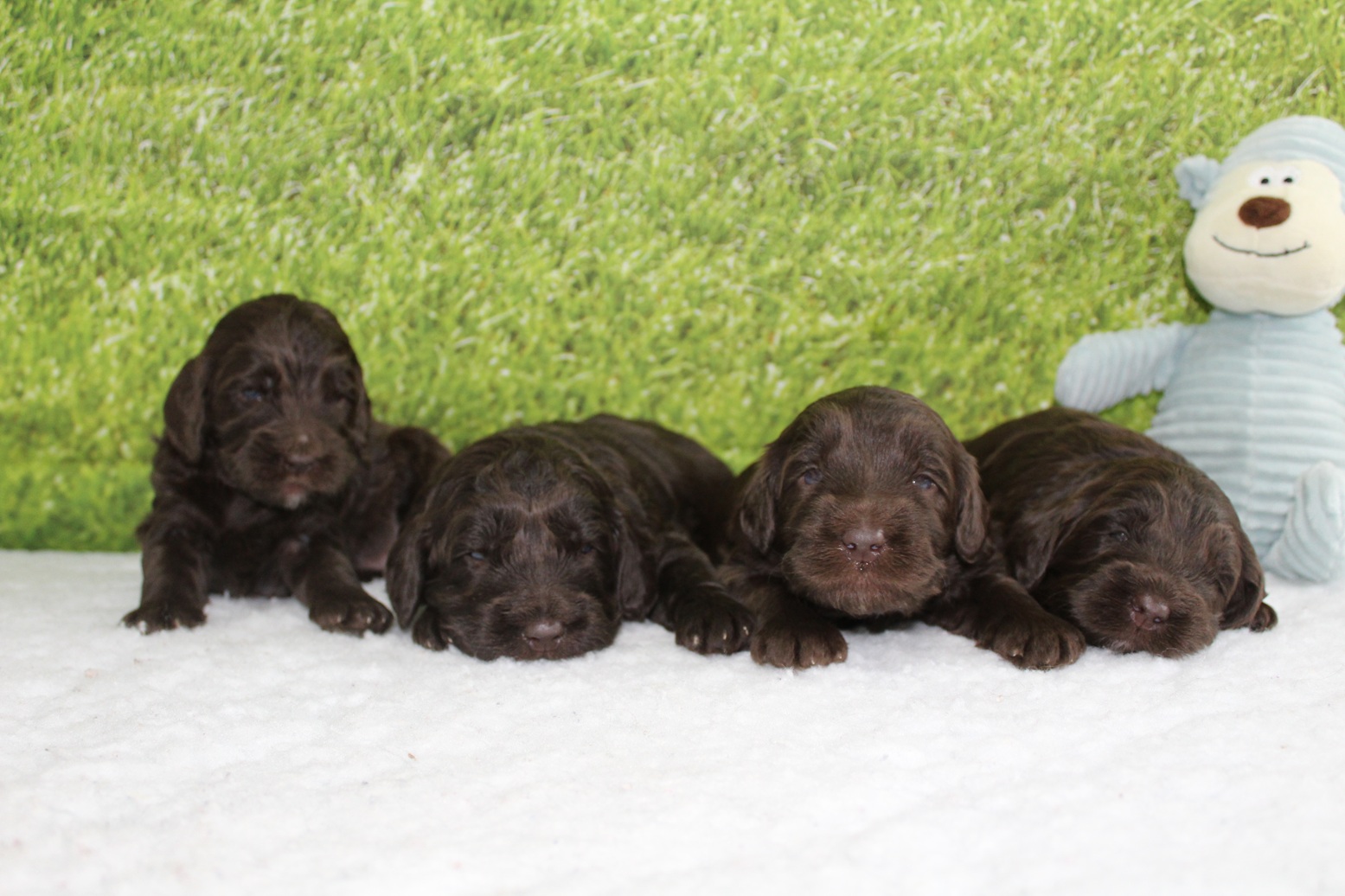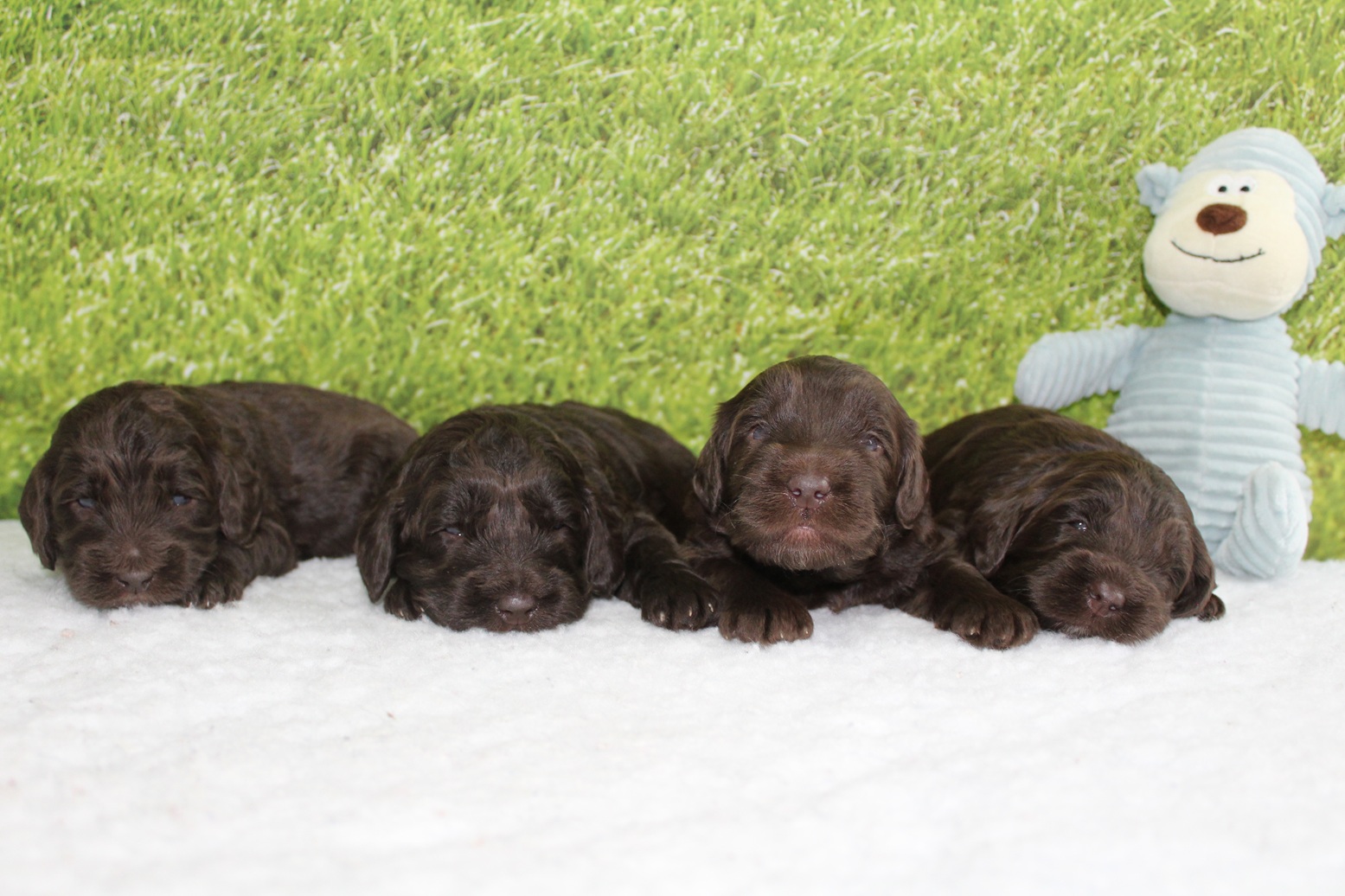 Fudge has welcomed her final litter and we have 6 stunning chocolate puppies (2 girls, 4 boys). Fudge's puppies are always beautiful, chunky and they usually keep their gorgeous chocolate colour too. You can see two pictures of her current litter above along-with two pictures of two of her previous puppies at older stages as they are just too gorgeous! The puppies will most likely reach around 18-20" at the shoulder and have wavy fleece coats. Please get in touch if you'd like to join this litter