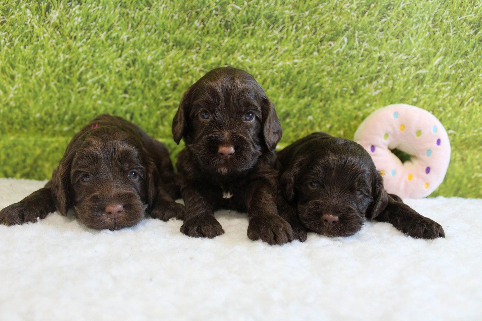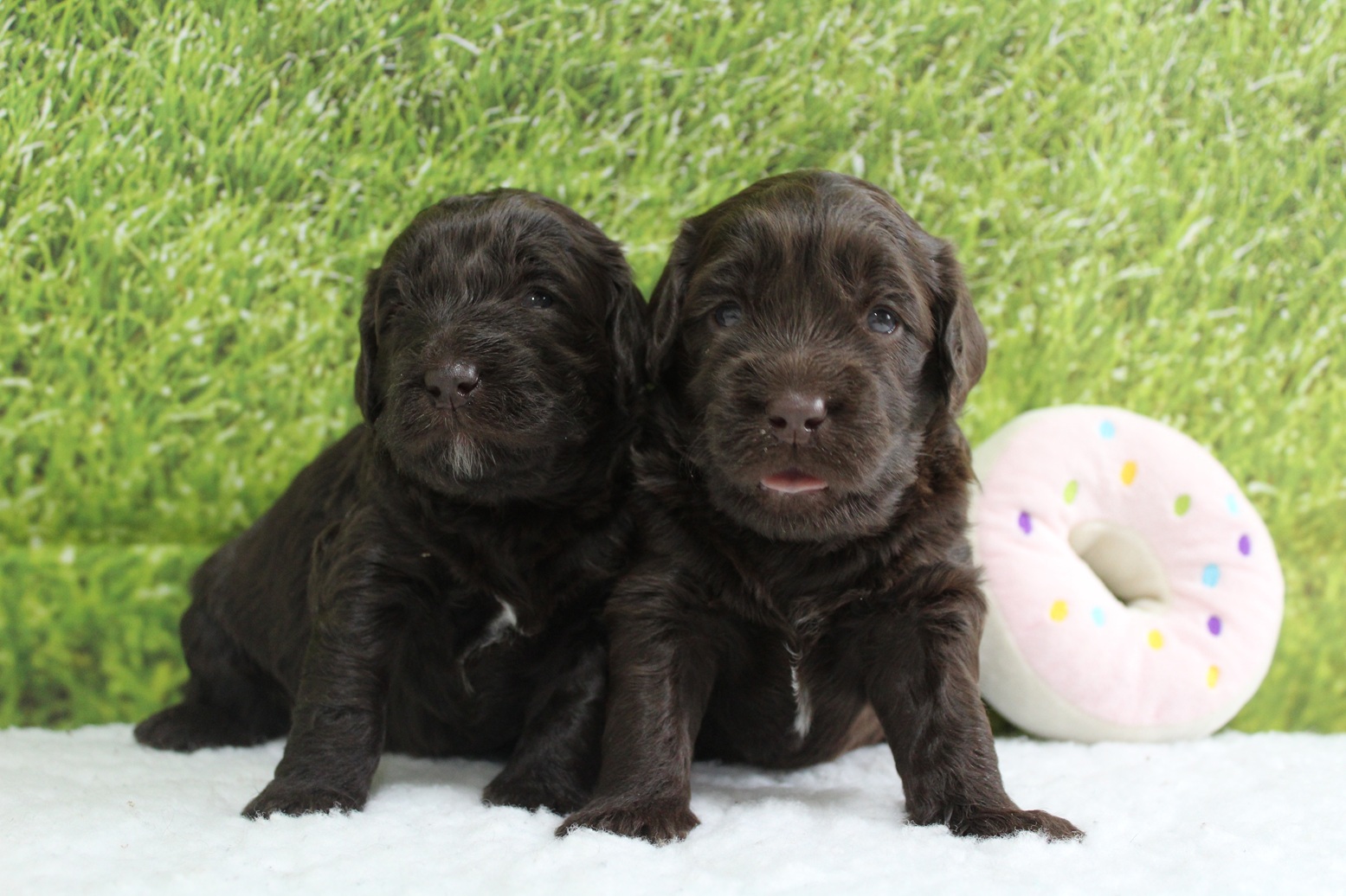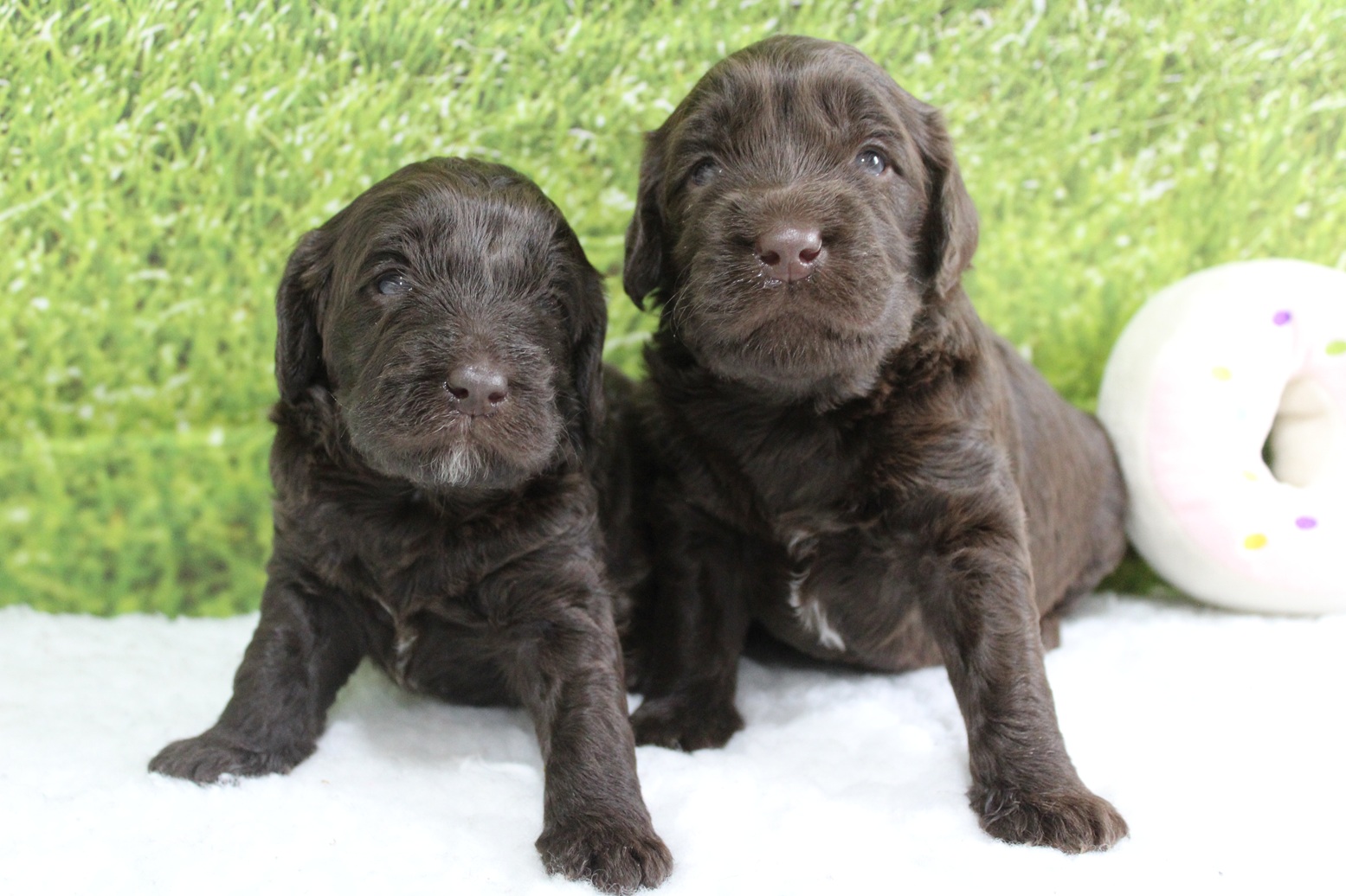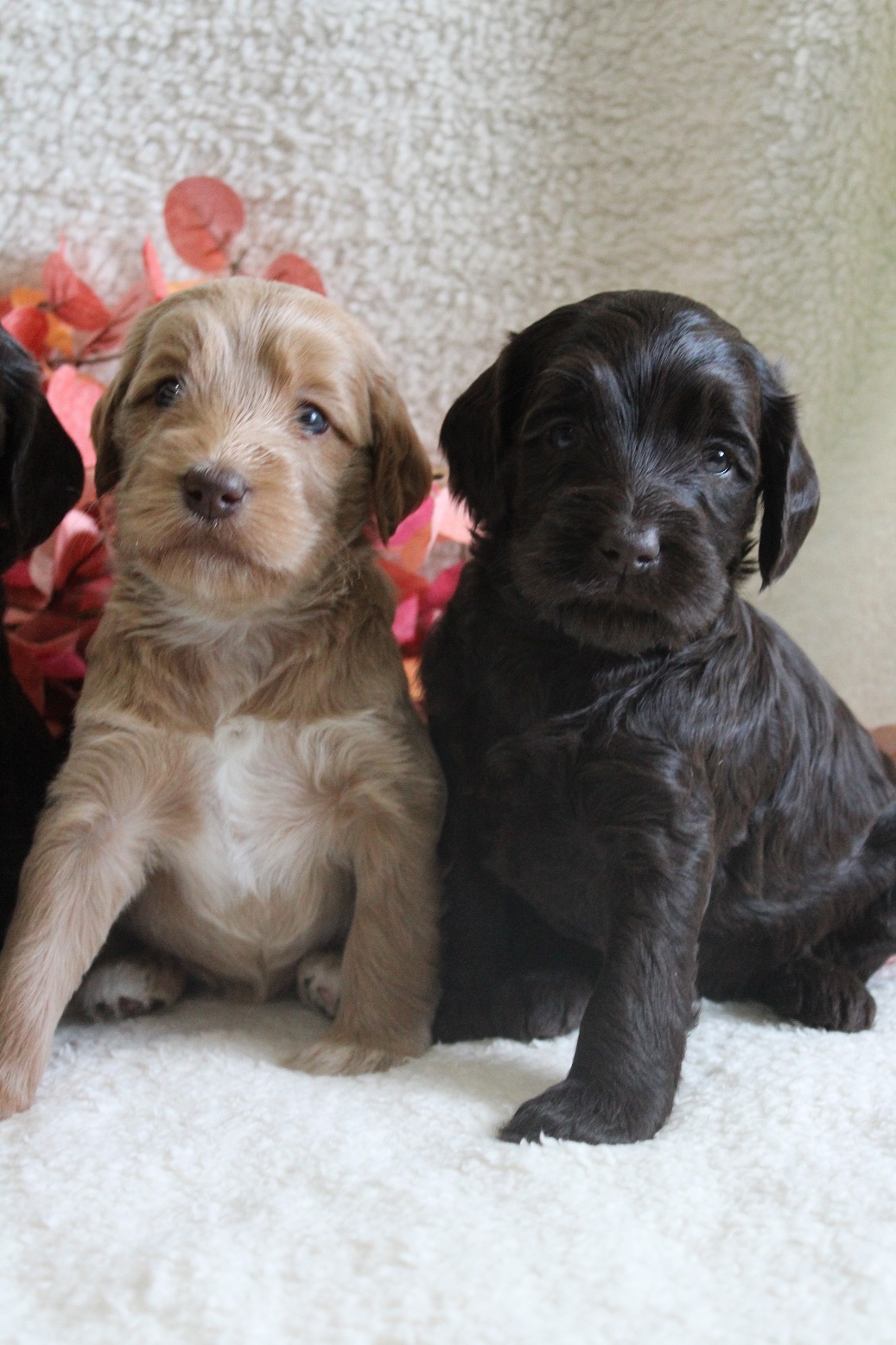 Fudge has welcomed her final litter and we have 6 stunning chocolate puppies (2 girls, 4 boys). Fudge's puppies are always beautiful, chunky and they usually keep their gorgeous chocolate colour too. You can see two pictures of her current litter above along-with two pictures of two of her previous puppies at older stages as they are just too gorgeous! The puppies will most likely reach around 18-20" at the shoulder and have wavy fleece coats. Please get in touch if you'd like to join this litter